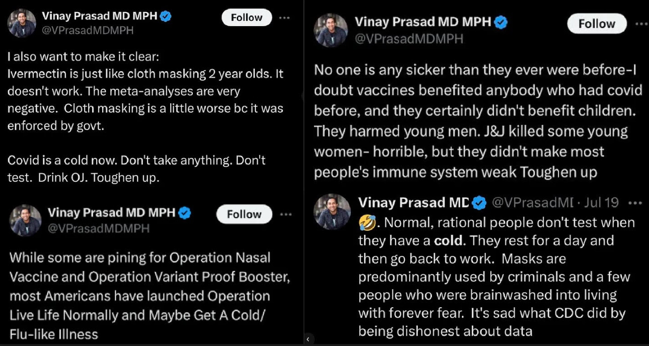 Vinay Prasad spent the past five years destroying whatever respect and credibility he had with medical professionals to perform sensationalist antics for his social media audience. Now he is doubling down on these antics as a senior leader of the Food & Drug Administration. This is fraud; civic service is not a brand building opportunity.