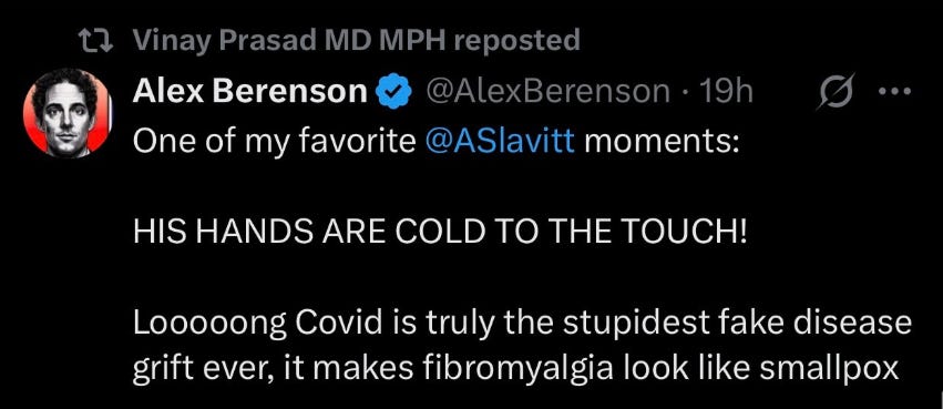 Vinay Prasad, do you truly consider children suffering long-term complications from COVID-19 to actually all be “lying fake disease grifters,” according to a tweet you shared by disgraced anti-vaccine crank Alex Berenson?