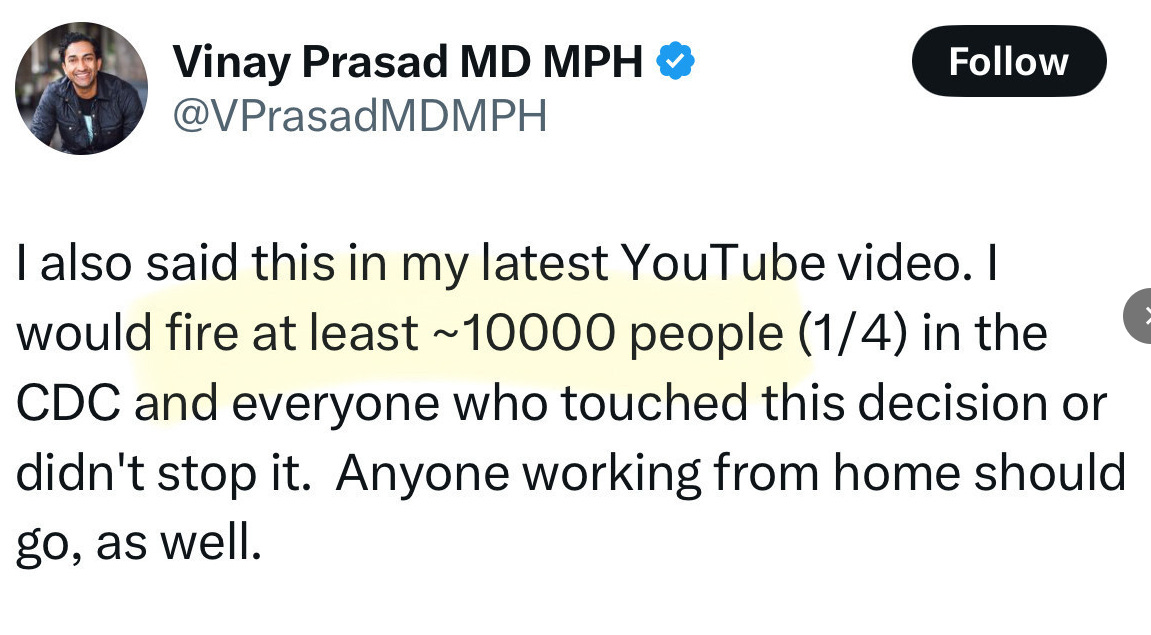 It was obvious that if given power, Vinay Prasad would exploit it as an opportunity to abuse, as he himself openly fantasized about firing thousands upon thousands of federal employees prior to joining Makary’s FDA. Now in power, Prasad has consistently appeared in the headlines for his unprofessional antics and inappropriate misconduct, including sexual harassment. It should surprise no one that the same misogyny Prasad brought to social media would be expanded upon in the Food & Drug Administration.
