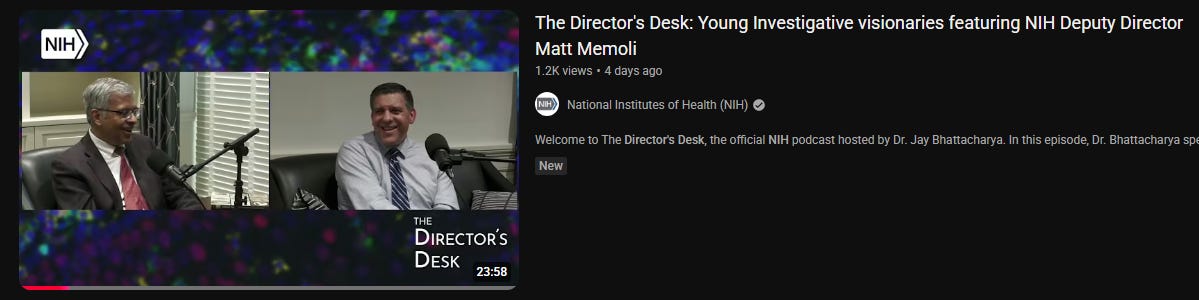 So yes, Jay Bhattacharya is back to rambling in front of a camera and microphone, spewing ignorance about topics he arrogantly knows very little about. Now Mr. Bhattacharya is doing it while collecting a paycheck funded by you, the American taxpayer. Even worse, Mr. Bhattacharya has grown even bolder in his obsession with mugging in front of a camera: converting a piece of the NIH campus into a podcast studio, launching his own program generically named: "The Director's Desk."