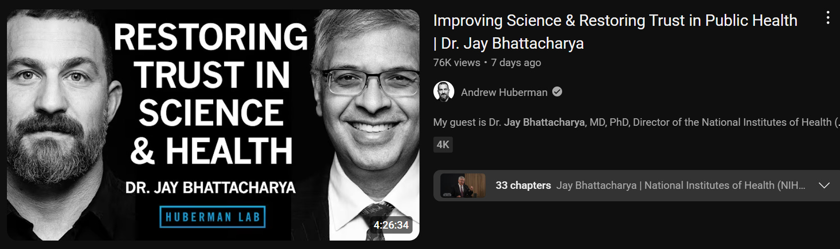 As the National Institutes of Health crumble into irrelevancy, Jay Bhattacharya's top priority is producing even more worthless podcasts. There is no doubt that Bhattacharya has no actual interest in what the National Institutes of Health does in the pursuit of saving lives, instead is enjoying the benefits and prestige of his position as a purely political figurehead - lending credibility to the government’s censorship of scientists, a total admission that he never took “censorship” seriously. This is a clear case of fraud being perpetuated against the American taxpayer.