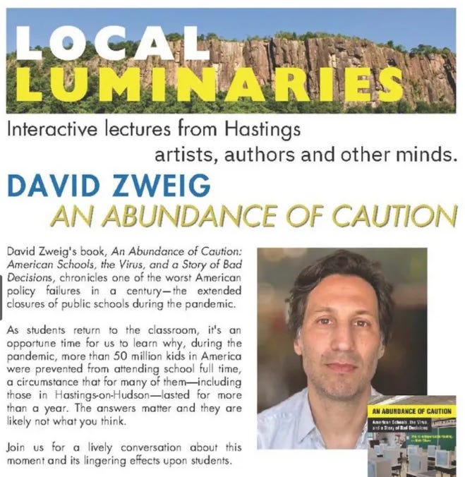 I am thankful that Zweig's upstate community, where the average home price is well over a million dollars, did not have to directly experience this same nightmare. Preventative public health mandates saved a lot of lives, to varying degrees of effectiveness, and one could make good faith critiques of how to better prevent COVID-19 outbreaks in schools & needless death - including thousands of American children. Yet, in his talk at the Hastings Public Library, Zweig's primary grievance is that his feelings were hurt, and there was nothing to fear about a new SARS virus.
